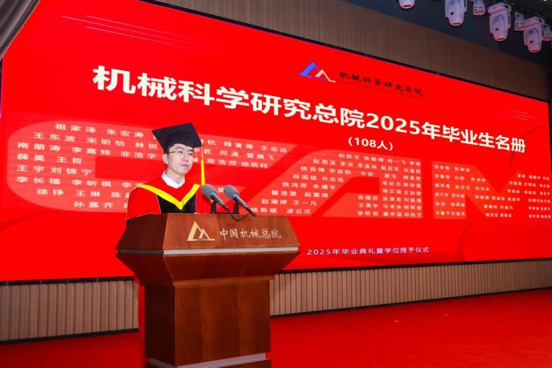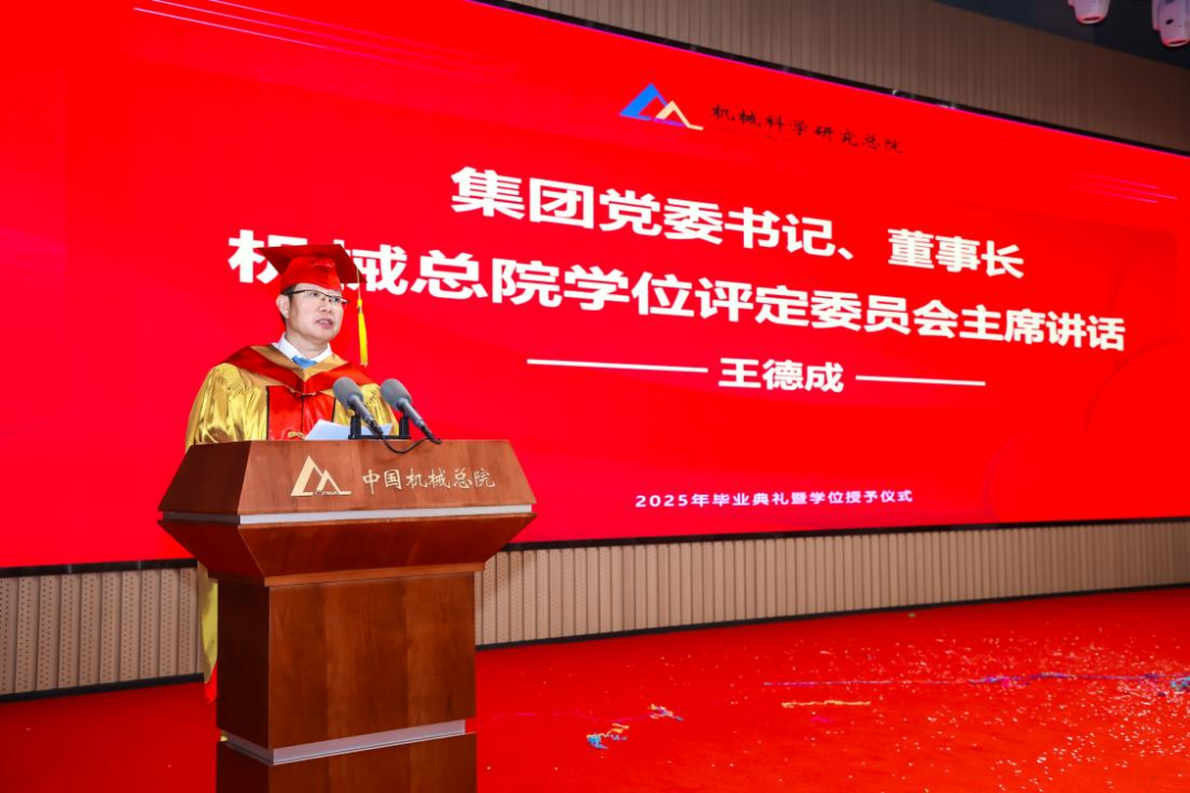 機械總院學位評定委員會主席、集團黨委書記、董事長王德成,集團黨委副書記、總經(jīng)理孟祥宇,集團黨委副書記、董事李玉鑫,集團黨委委員、副總經(jīng)理王宇,機械總院學位評定委員會副主席、集團副總經(jīng)理李愛國,集團副總經(jīng)理姜超出席典禮,機械總院學位評定委員會委員、京內(nèi)外各二級單位領導、導師代表、研究生管理部門負責人、2025屆畢業(yè)生及家屬共計190余人齊聚一堂,共同見證這一重要時刻。典禮由機械總院學位評定委員會秘書長、研究生院副院長邊翊主持。