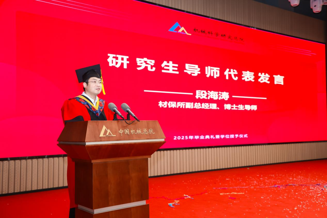 材保所副總經(jīng)理、博士生導師段海濤作為導師代表發(fā)言,為全體畢業(yè)生送上囑托和期望。他希望同學們樹立“大志向”、堅守“大擔當”、秉持“大情懷”,用真才實學鐫刻屬于自己的璀璨印記。