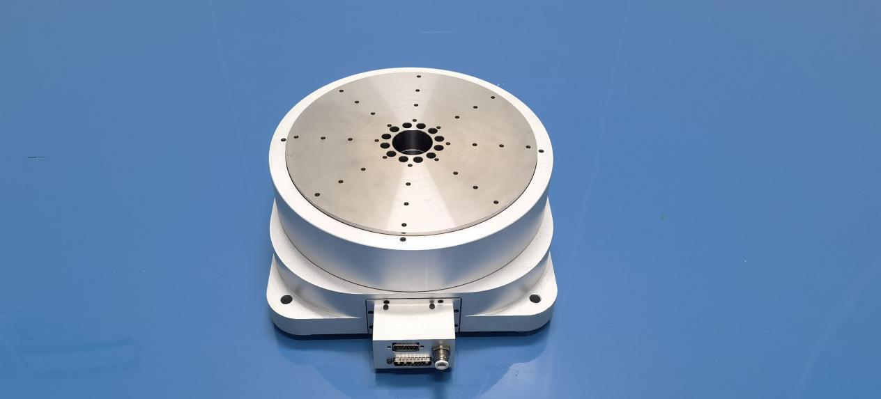 在半導(dǎo)體晶圓加工展區(qū),直徑800mm氣體靜壓轉(zhuǎn)臺以徑向/軸向回轉(zhuǎn)精度≤0.1μm,轉(zhuǎn)角精度±0.5"穩(wěn)定持續(xù)運(yùn)轉(zhuǎn),其采用的微孔節(jié)流+真空吸附復(fù)合技術(shù),成功解決傳統(tǒng)氣浮系統(tǒng)承載剛度不足的痛點(diǎn);面向半導(dǎo)體設(shè)備制造領(lǐng)域?qū)Τ軞飧≈鬏S的重大需求,針對超精密氣浮靜壓主軸結(jié)構(gòu)設(shè)計(jì)、微孔節(jié)流器、微孔陣列精密加工等核心技術(shù)瓶頸,創(chuàng)新性提出對稱式熱耗散通道設(shè)計(jì),有效抑制主軸非對稱熱變形,實(shí)現(xiàn)軸向/徑向回轉(zhuǎn)精度≤0.1μm,攻克SiC晶圓加工中剛性不足與熱變形耦合導(dǎo)致的亞表面損傷難題,實(shí)現(xiàn)納米級面形精度與亞微米級厚度一致性,軸向剛度較傳統(tǒng)T型結(jié)構(gòu)大幅提升,承載力突破4900N。